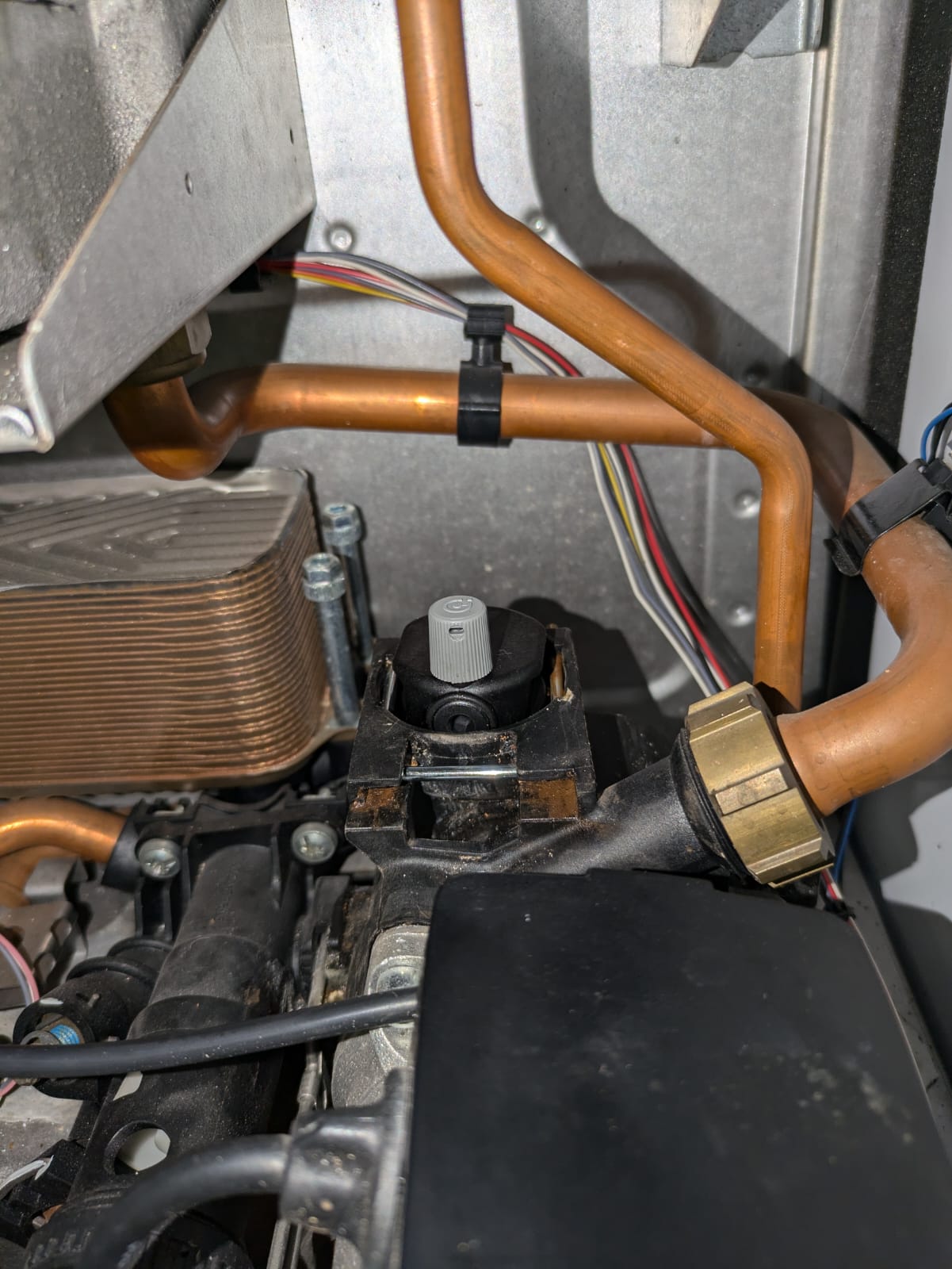 Sur la deuxième photo, vous découvrez le purgeur automatique remplacé par un modèle neuf, propre et parfaitement fonctionnel. Ce remplacement permet de :